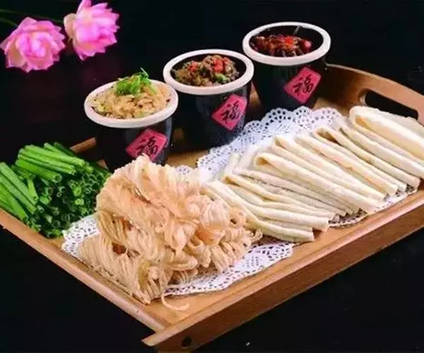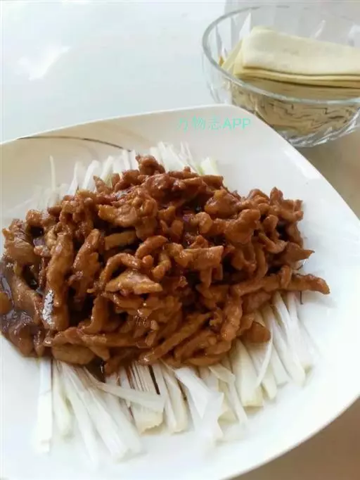 1、将里脊肉切成筷子粗的丝、葱切丝、豆腐皮切5*5CM的大块备用。 京酱肉丝做法图示