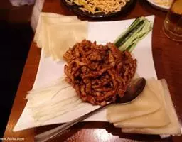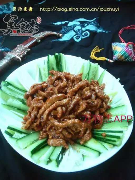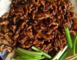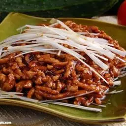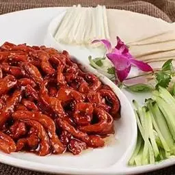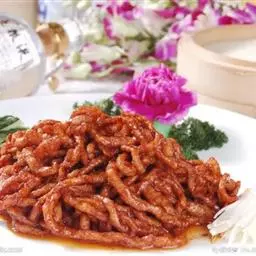 京酱肉丝,是一道知名度很高的菜肴,它是北京菜中的经典代表菜之一。制作时选用猪瘦肉为主料,辅以甜面酱、葱、姜及其它调料,用北方特有烹调技法“六爆”之一的“酱爆”烹制而成。 成菜后,咸甜适中,酱香浓郁,风味独特。