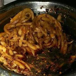 4.炒锅上火放油,加入甜面酱略炒,放入葱姜水、料酒、味精、白糖,不停炒动甜面酱,待白糖全部熔化,且酱汁开始变粘时,将肉丝放入不停地炒,使甜面酱均匀地沾在肉丝上;