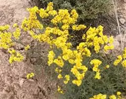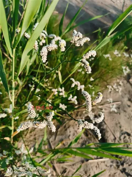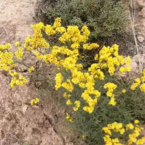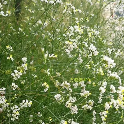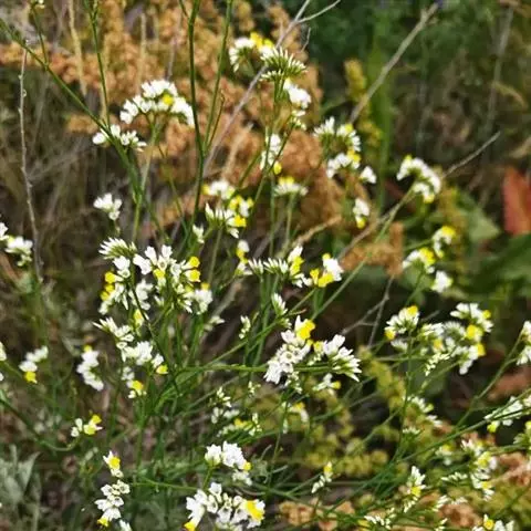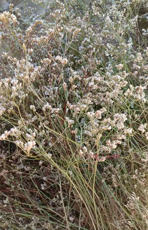 二色补血草(学名:Limonium bicolor (Bag.) Kuntze):白花丹科,补血草属多年生草本植物。高可达60厘米,全体光滑无毛。茎丛生,直立或倾斜。叶多根出;匙形或长倒卵形,基部窄狭成翅柄,近于全缘。花茎直立,多分枝,花序着生于枝端而位于一侧,或近于头状花序;萼筒漏斗状,棱上有毛,白色或淡黄色,宿存;花辩匙形至椭圆形;雄蕊着生于花瓣基部;蒴果5棱,包于萼内。为盐碱地拓荒植物。