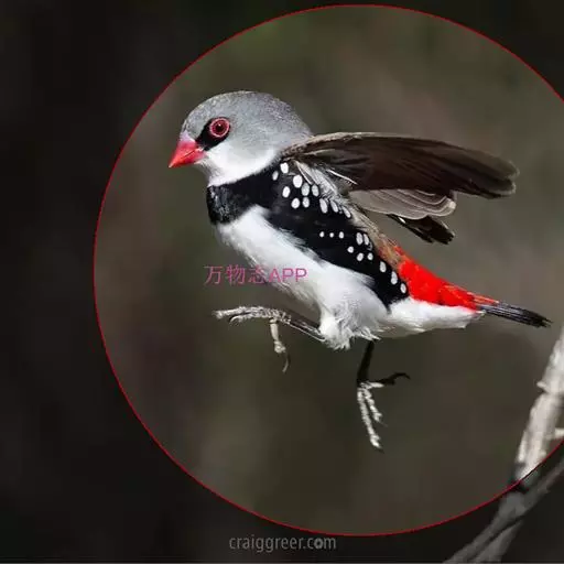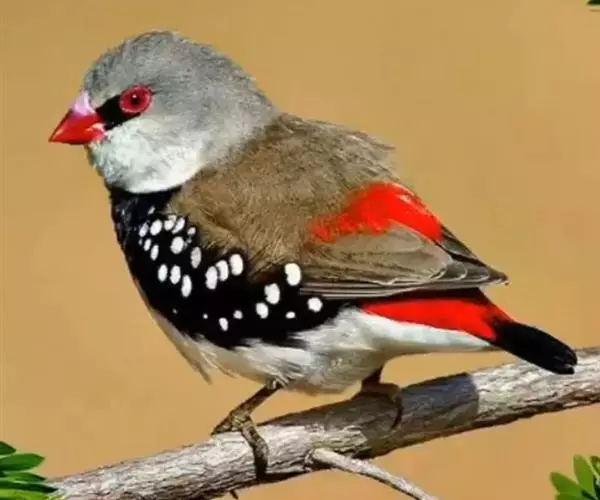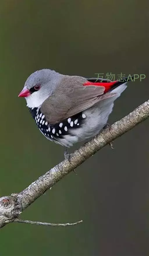 红梅花雀小型鸟类,体长9-10厘米。雄鸟通体朱红色,背、肩、胸等满布白色小斑点,…
