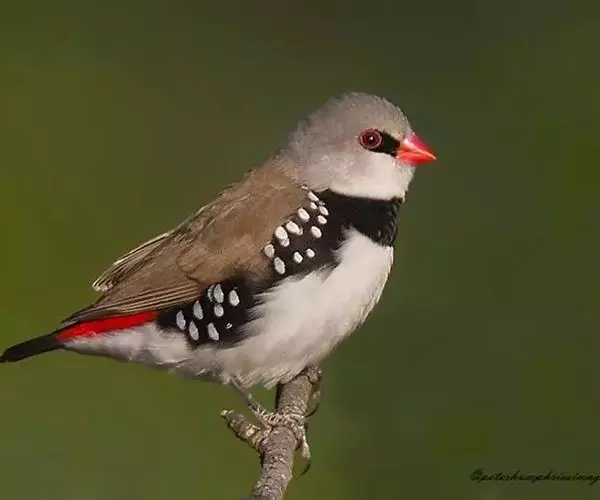 斑胸草雀,又名金山珍珠,是雀形目梅花雀科的小型鸟类。该鸟全长10厘米左右,胸和尾羽有黑白斑纹,雄鸟…