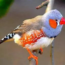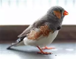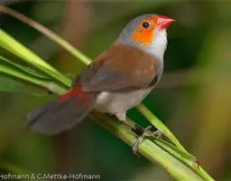 橙颊梅花雀体长约10厘米,头部灰色,两侧有大块橙色区域,嘴基及眼下方有黑纹,两条黑纹间呈白色,…