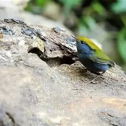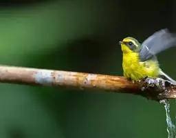 黑脸鹟莺:体长10厘米,是有特色的体小而多彩的莺鸟。粗眉纹,颏、喉及尾下覆羽黄色,脸罩黑,…