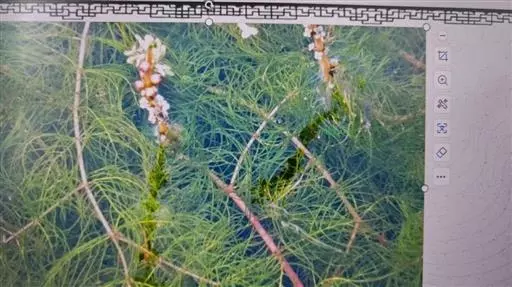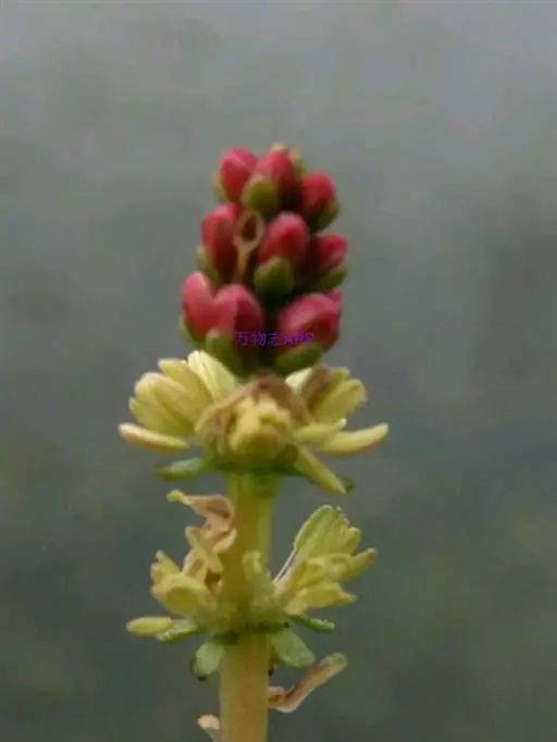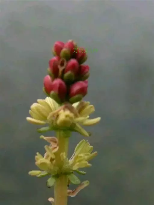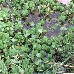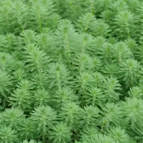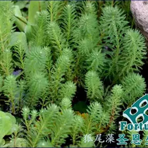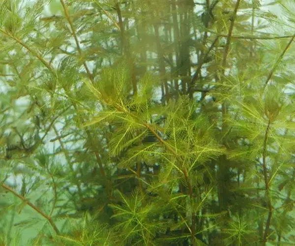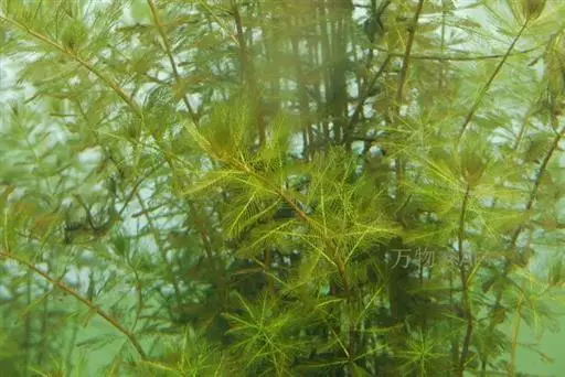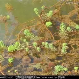 穗状狐尾藻,别名:泥茜、聚藻、金鱼藻,拉丁文名:Myriophyllum spicatum L. 小二仙草科、狐尾藻属多年生沉水草本。根状茎发达,在水底泥中蔓延,节部生根。茎圆柱形,叶柄极短或不存在。花两性,单性或杂性,雌雄同株,单生于苞片状叶腋内,由多数花排成近裸颓的顶生或腋生的穗状花序,柱头羽毛状,向外反转,大苞片矩圆形,全缘或有细锯齿,较花瓣为短,小苞片近圆形,边缘有锯齿。分果广卵形或卵状椭圆形,具4纵深沟,沟缘表面光滑。花期从春到秋陆续开放,4-9月陆续结果。