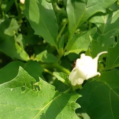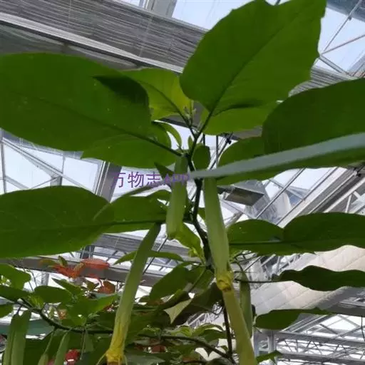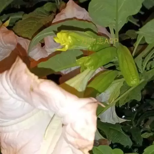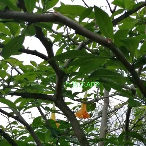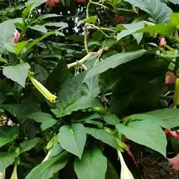 木本曼陀罗,为茄科、曼陀罗属的小乔木,茎粗、叶大,叶卵状心形,顶端渐尖,长15-28厘米,宽8-15厘米,嫩枝和叶两面均要被柔毛,花白色,喇叭状下垂,长达20余厘米,花期6-10月。其洁白硕大的花朵下垂悬吊,犹如灯笼,是种观赏价值很高的花木。