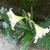花单生,俯垂,花梗长3-5厘米。花萼筒状,中部稍膨胀,长8-12厘米,直径2-2.5厘米,裂片长三角形,长1.5-2.5厘米;花冠白色,脉纹绿色,长漏斗状,筒中部以下较细而向上渐扩大成喇叭状,长达23厘米,檐部裂片有长渐尖头,直径8-10厘米;雄蕊不伸出花冠筒,花药长达3厘米;花柱伸出花冠筒,柱头稍膨大。浆果状蒴果,表面平滑,广卵状,长达6厘米。