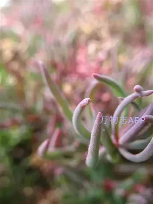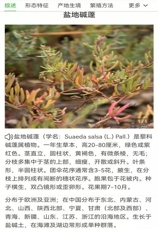 一年生草本,高20-80厘米,绿色或紫红色。茎直立,圆柱状,黄褐色,有微条棱,无毛;分枝多集中于茎的上部,细瘦,开散或斜升。叶条形,半圆柱状,通常长1-2.5厘米,宽1-2毫米,先端尖或微钝,无柄,枝上部的叶较短。