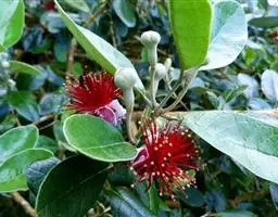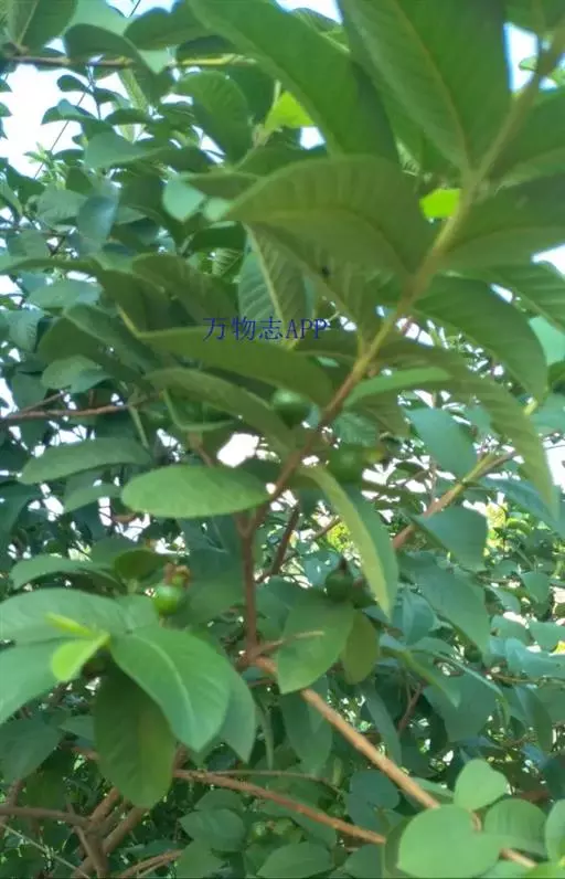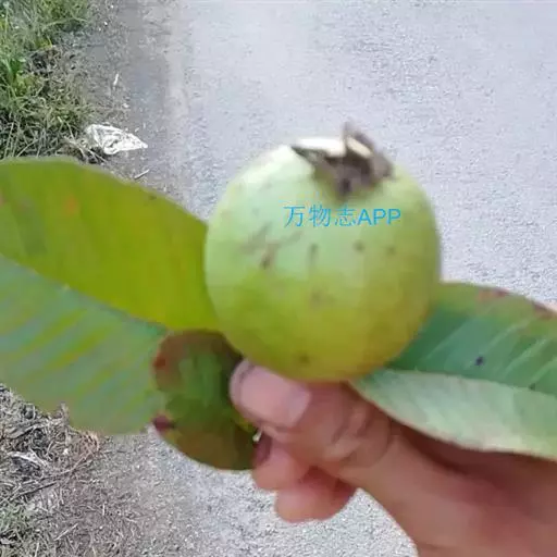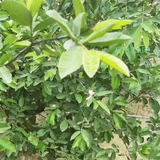 番石榴(Psidium guajava Linn.别名:芭乐,鸡屎果,拔子,喇叭番石榴)桃金娘科乔木,高达13米;树皮平滑,灰色,片状剥落;嫩枝有棱,被毛。叶片革质,长圆形至椭圆形,先端急尖或者钝,基部近圆形,上面稍粗糙,下面有毛,侧脉常下陷,网脉明显;叶柄长5毫米。花单生或者2-3朵排成聚伞花序;萼管钟形,有毛,萼帽不规则裂开;花瓣白色;雄蕊长6-9毫米;子房下位,与萼合生,花柱与雄蕊同长。浆果球形、卵圆形或梨形,顶端有宿存萼片,果肉白色及黄色,胎座肥大,肉质,淡红色;种子多数。