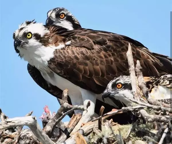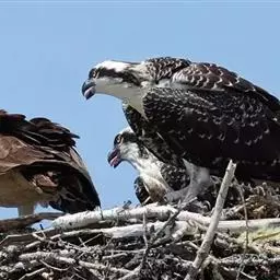 繁殖期在中国南方通常为2-5月,在东北地区大多为5-8月。雄鸟和雌鸟配对以后常常比翼双飞,鸣声不断。鹗的婚飞别具一格,雄鸟首先在空中翱翔,身体呈一个很陡的角度,爪子上紧紧地抓着一条鱼或者一根骨头,一边吃力地飞行,一边摇晃着双脚,有时甚至向后倒着飞行,同时发出一种激昂的叫声。雌鸟则高声地应和着,与雄鸟一起上下翻飞。通常营巢于水边的树冠之上,也在水边的悬崖峭壁和岩石上营巢。在食物丰富的地方,会有很多巢密密麻麻地聚集在一起,据说在一个面积不到1200公顷的区域上就曾发现300多个巢。