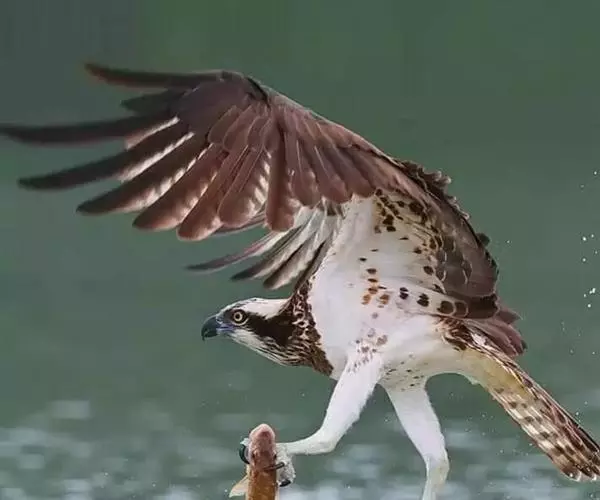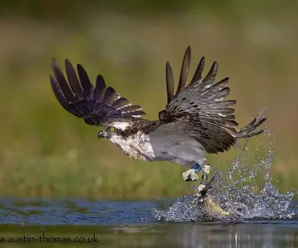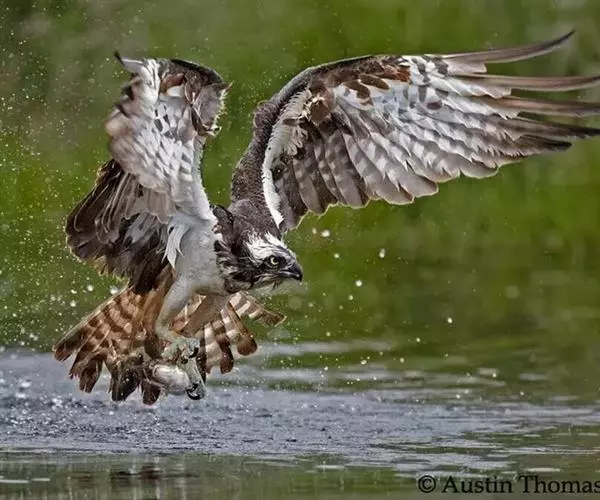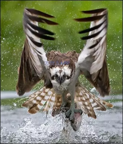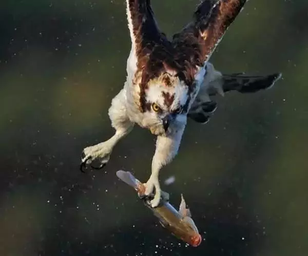 照片中,鹗眼神坚定,飞速朝目标猎物飞去,在飞出水面的一瞬间,它的两只爪各抓住一条鳟鱼,翅膀完全张开,翼展足足有1.8米宽,且十分有力。49岁的俄罗斯业余摄影师伊戈尔已经在此等候有好几个小时,捕捉到这一幕是完全出乎意料的,因为通常情况下鹗要尝试6到7次才可能成功捕捉到猎物,像这样一次出动就捕到两只猎物的情况十分罕见,而且鹗的速度非常快,就使得拍摄更加困难。