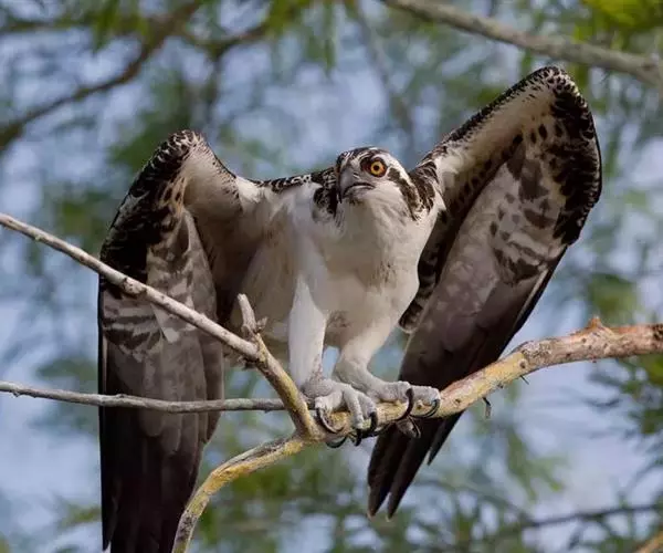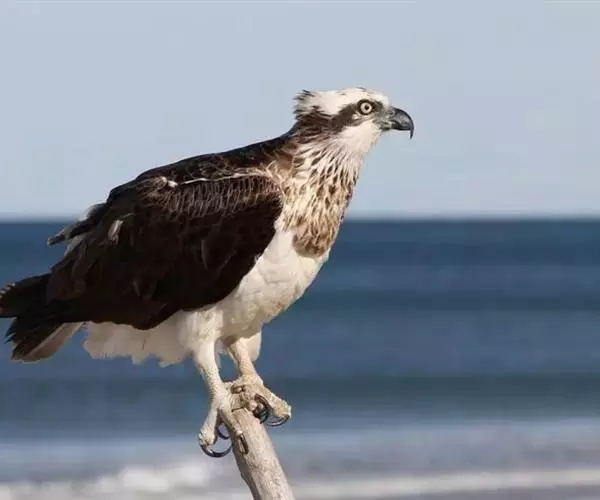 鹗(学名:Pandion haliaetus):是隼形目、鹗科、鹗属仅有的一种中型猛禽。雌雄相似。体长51-64厘米,体重1000-1750克。头部白色,头顶具有黑褐色的纵纹,枕部的羽毛稍微呈披针形延长,形成一个短的羽冠。头的侧面有一条宽阔的黑带,从前额的基部经过眼睛到后颈部,并与后颈的黑色融为一体。上体为暗褐色,略微具有紫色的光泽。下体为白色,胸部的暗色纵纹和飞羽,以及尾羽上相间排列的横斑均极为醒目。虹膜淡黄色或橙黄色,眼周裸露皮肤铅黄绿色,嘴黑色,蜡膜铅蓝色,脚和趾黄色,爪黑色。