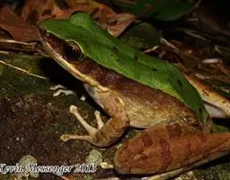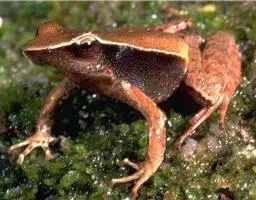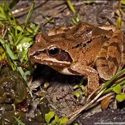 中国林蛙(学名:Rana chensinensis):雌蛙体长44~53毫米,雄蛙较小;头较扁平,头长宽相等或略宽;吻端钝圆,略突出于 下颌,吻棱较明显;鼻孔位于吻眼之间,鼻间距大于眼间距而与上眼睑宽。背侧褶在鼓膜上方呈曲折状;后肢长为体长的185%左右,后肢前伸贴体时胫跗关节超过眼或鼻孔;外侧3趾间几乎近2/3蹼;鼓膜部位有三角形黑斑。雄蛙第一指基部的两个大婚垫内下侧间的间距明显,近腕部一团不大于指部一团;有一对咽侧下内声囊。