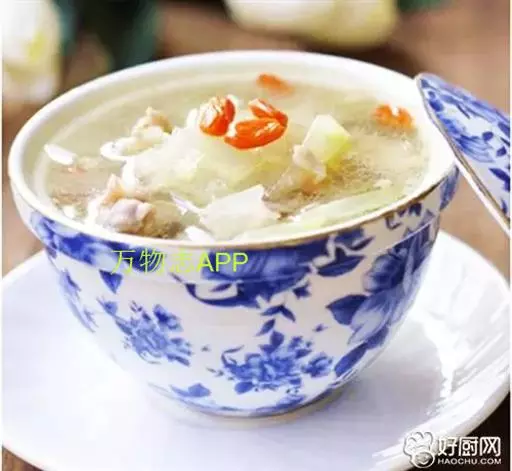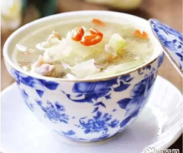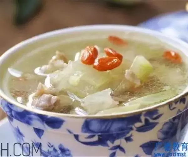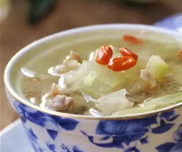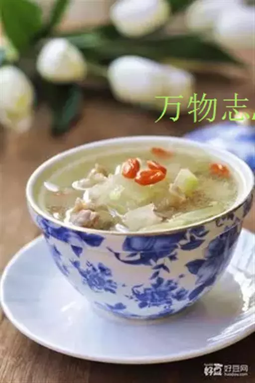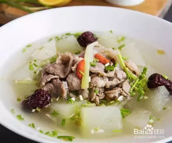 原料:冬瓜100克,瘦羊肉80克,枸杞3克,生姜10克,葱10克。