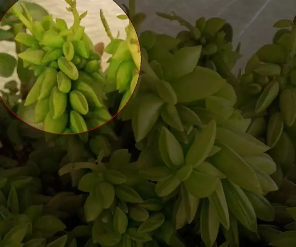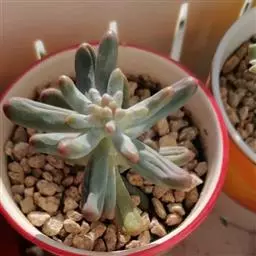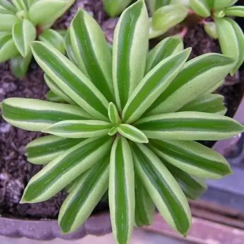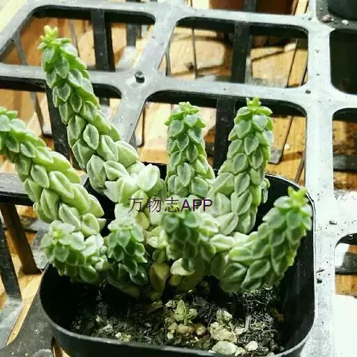 肉质小灌木,茎10厘米长。叶顶端轮生,长5—6厘米、宽1.7厘米、厚0.6