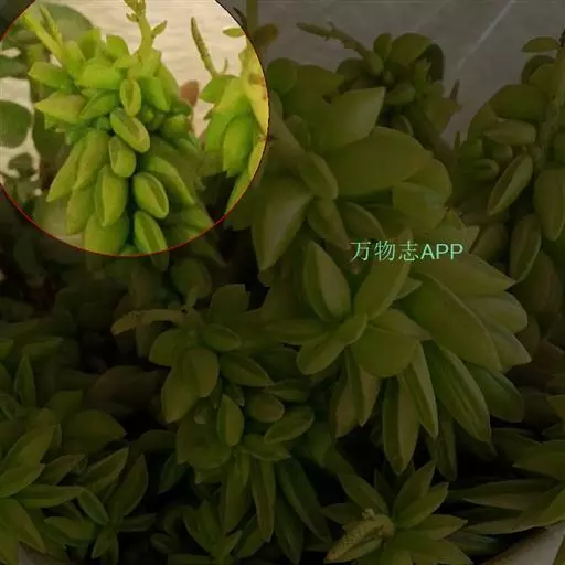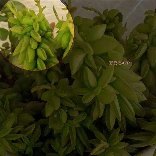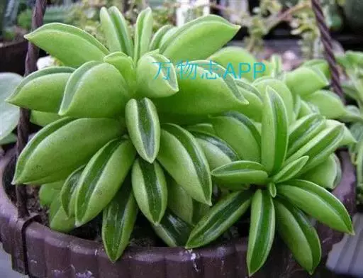 厘米,先端尖、基部棒糙形,一侧中间圆弧形突出,另一侧平直,弧形一侧的边缘较薄,有透明的条纹,平直的一侧边缘厚,整个叶就像一把斧子。带粉的灰绿色。花序很长,花黄绿色。