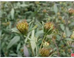 总苞近圆柱状钟形,长6-8毫米,宽6-9毫米,无外层苞片;总苞片18-20个,披针形或线状披针形,宽1-1 .5毫米,顶端渐尖或急尖,绿色或紫色,草质,具狭膜质边缘,外面被密或有时疏蛛丝状毛,或多少脱毛。舌状花13-15,管部长3-3.5毫米;舌片黄色,长圆形,长6.5-7毫米,宽2.5-3毫米,顶端钝,具3细齿,4脉。管状花多数,花冠黄色,长约8毫米,管部长4毫米,檐部漏斗状;裂片卵状披针形,长1.2毫米,急尖,顶端具乳头状毛。花药长2.2毫米,基部钝,附片卵状披针形;花柱分枝长约1毫米。