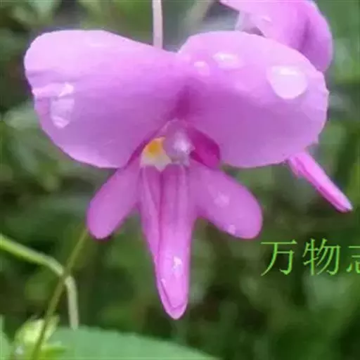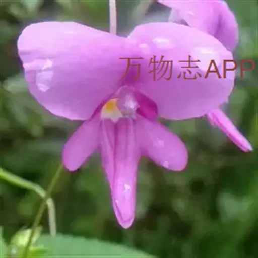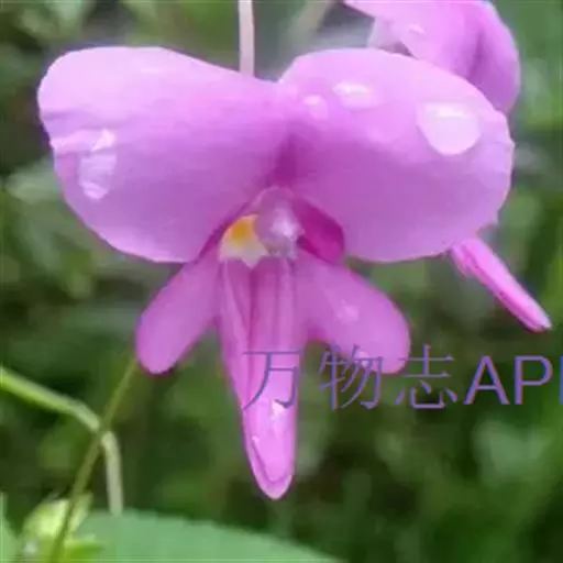 总花梗单生于上部叶腋,长4-7厘米,具2,稀单花;花梗细,长1.5-3厘米,上部具苞片;苞片披针形,长5-7毫米,顶端渐尖,宿存。花紫色,长3.5-4.5厘米,侧生萼片2,绿色,宽卵形,长5-6毫米,宽3-4毫米,顶端长突尖,边缘具细齿。旗瓣大,扁圆形或肾形,长16毫米,宽35毫米,顶端凹入,背面中肋具窄龙骨状突起,先端具小尖头;翼瓣无柄,长26毫米,2裂,基部裂片长圆形,顶端圆形,上部裂片斧形,具三角状浅裂,背部具不明显的小耳;唇瓣窄漏斗形,长4-4.5厘米,口部斜上,长15毫米,先端具喙尖,基部渐狭成长2-2.5厘米内弯的细距。花丝线形,长5毫米;花药顶端钝。子房纺锤状,直立,长5-6毫米,顶端具5-6小齿裂。蒴果长圆形,长1.8-2厘米,顶端具3-5齿裂。种子多数,球形,长3毫米,褐色,光滑。花期9-10月。