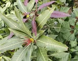 叶互生,具柄,叶片膜质,长圆形或长圆状披针形,长5-9 (-12) 厘米,宽2.5-4厘米,顶端渐尖,基部楔状下延成长1-2.5的叶柄,常具2球形腺体,边缘具圆齿状齿,齿端微凹,具小尖,侧脉9-12对,上面深绿色,下面淡绿色。
