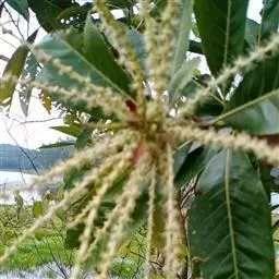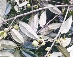 苦槠〔学名:Castanopsis sclerophylla (Lindl.)Schott.〕国家二级保护植物 ,是山毛榉目,壳斗科,锥属乔木,高稀达15米,胸可达50厘米,树皮浅纵裂,枝、叶二列均无毛。通常一侧略短且偏斜,叶片革质,花序轴无毛,雄穗状花序通常单穗腋生,壳斗有坚果偶有2-3个,近圆球形,顶部短尖,果脐位于坚果的底部,4-5月开花,10-11月开始结果成熟。