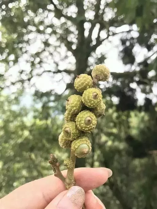 果序长8-15厘米,壳斗有坚果1个,偶有2-3,圆球形或半圆球形,全包或包着坚果的大部分,径12-15毫米,壳壁厚1毫米以内,不规则瓣状爆裂,小苞片鳞片状,大部分退化并横向连生成脊肋状圆环,或仅基部连生,呈环带状突起,外壁被黄棕色微柔毛;坚果近圆球形,径10-14毫米,顶部短尖,被短伏毛,果脐位于坚果的底部,宽7-9毫米,子叶平凸,有涩味。花期4-5月,果当年10-11月成熟。