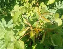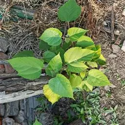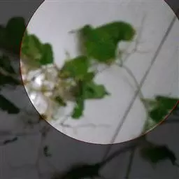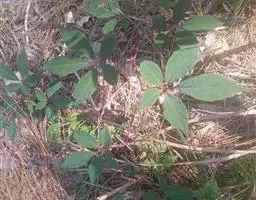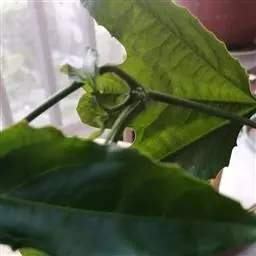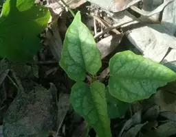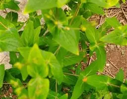 叶3浅裂,长5-5.5厘米,宽5-6厘米,基部心形,边缘有少数小尖齿,叶下面灰绿色,微被稀疏长柔毛;裂片卵形,先端钝圆并具小尖头;叶柄长达7厘米,被白色糙伏毛,从叶基部往下1厘米有2个头状腺体。