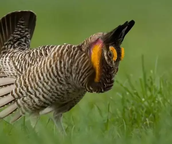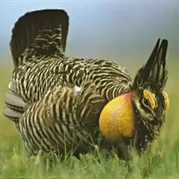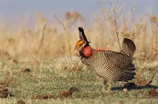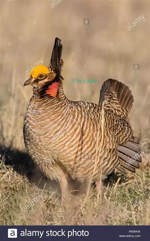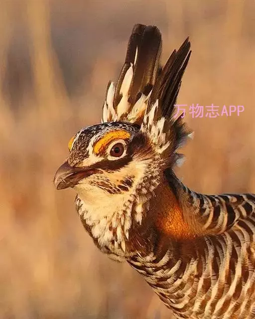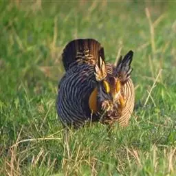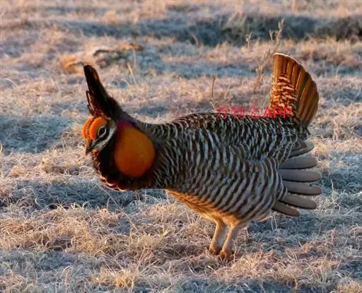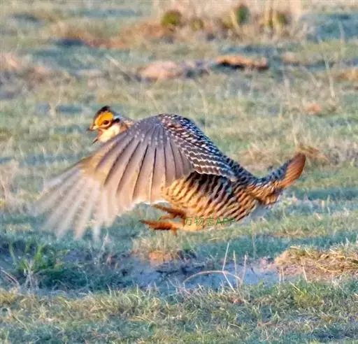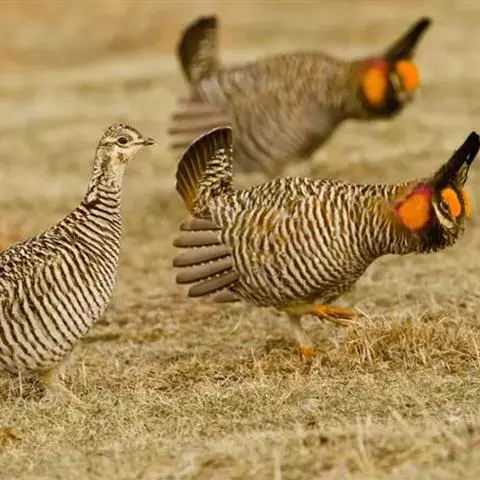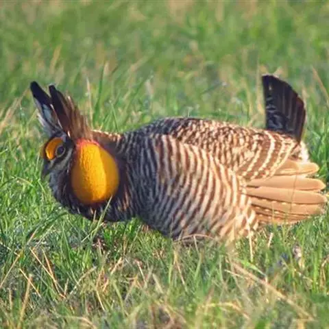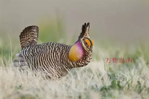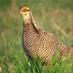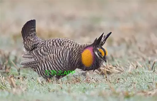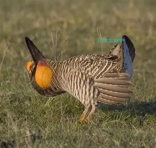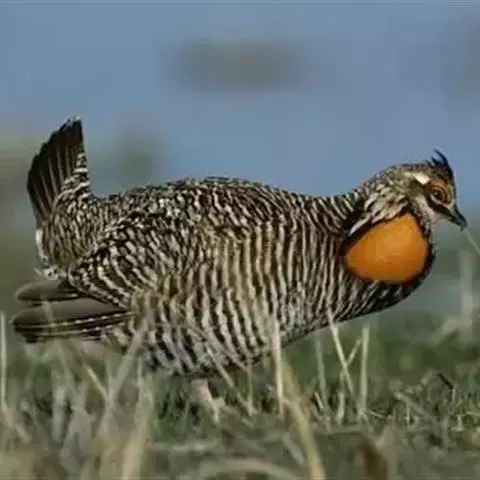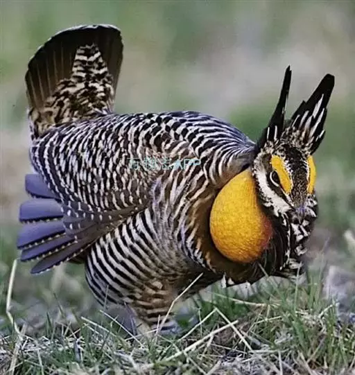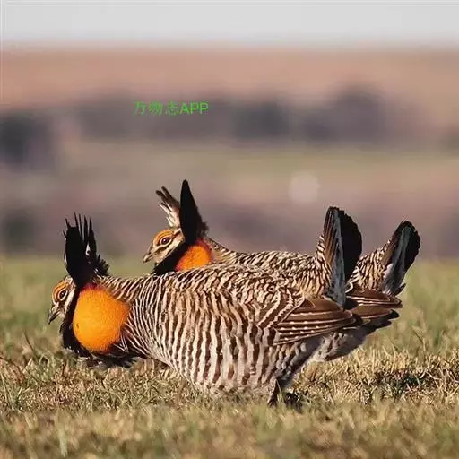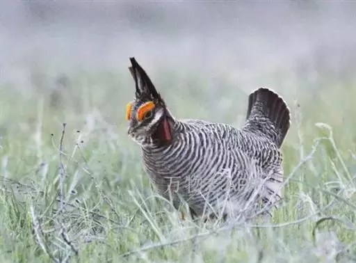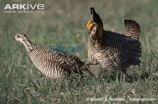 草原松鸡(学名:Tympanuchus cupido):体长43-47厘米,翼展69厘米,体重900-1100克。雄鸟头顶耸立的针状羽毛形成的两个尖顶羽冠。颈部和眼睛上方有黄橙色的膨胀的大气囊。雌鸟的上体是锈褐色,夹杂着黑色及皮黄色的的横斑,下体较淡。在交配季节,雄鸟会发出一个800米远都能听到的鸣叫声,胸部的气囊也会放大。虹膜褐色,嘴角黄色或白色,跗蹠被羽到趾。