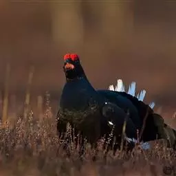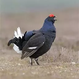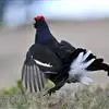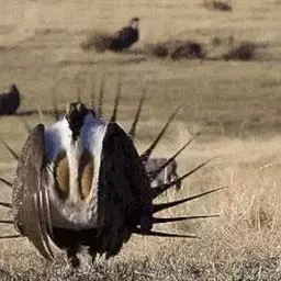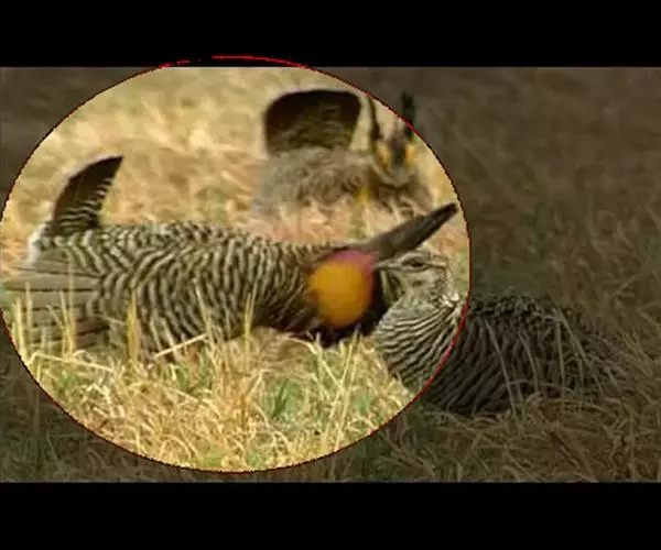 草原松鸡举行这种奇特的比舞炫耀。开始之前,雄松鸡作短程跑步,接着就表演快节拍的踢跶舞,发出打鼓一般的声音。它竖尾展羽,同时鼓起头部两侧色彩鲜艳的气囊。松鸡发出奇怪而宏亮的轰隆轰隆声,于是气囊逐渐萎缩,接着发出的声音却和农庄的鸡啼一样。它同时上跃,一落地就追逐任何靠近的雄鸟。两只雄鸟于是交斗一番,用翅膀互相击打。
