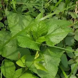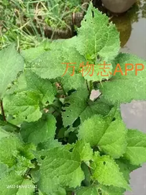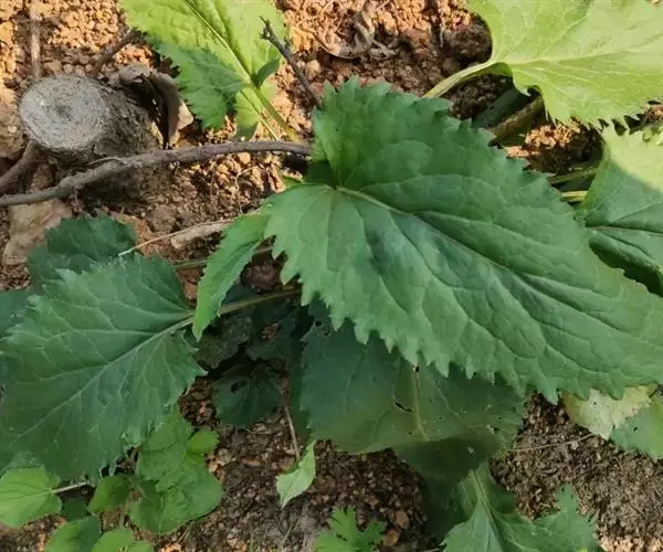 根状茎粗壮。茎直立,高100-150厘米,上部有斜升的分枝,被微毛。基部叶在花期枯萎,叶片心形,长9-15厘米,宽6-15厘米,边缘有具小尖头的齿,顶端尖,基部急狭成长约10-15厘米被微毛的柄;中部叶较小,卵状三角形,基部圆形或稍截形,有具翅的短柄;上部叶小,矩圆披针形或条形;全部叶两面被微糙毛,下面浅色,有三或五出脉,网脉显明。