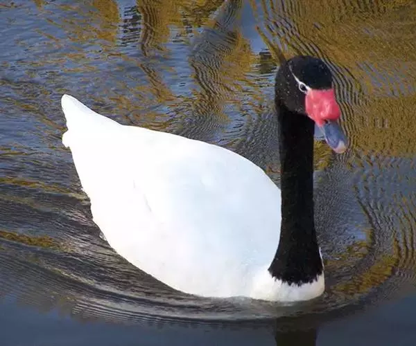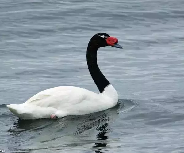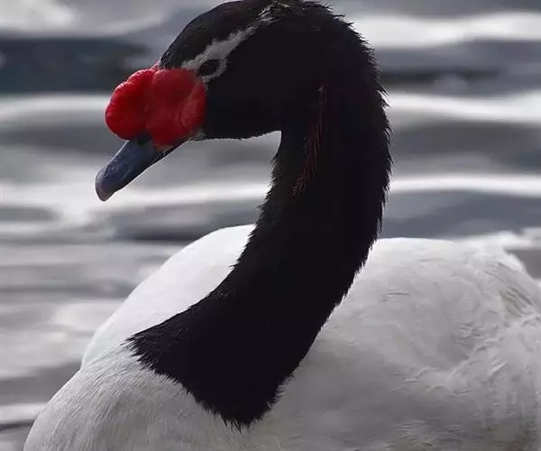 黑颈天鹅雄鸟和雌鸟羽色十分相似,只是雌鸟的体形比雄鸟要小。体长为90-130厘米,体重为3.5-4.4千克,是世界上体形最小的天鹅。身体的羽毛同大天鹅一样,也是雪白的颜色,但它的头部和颈部却是黑色的,因而显得与众不同,别具一格。在它的前额上,还生有一个鲜红色的大肉冠,叫做疣突,十分鲜艳而发达。它的脸颊呈红色,嘴为蓝灰色,嘴甲呈灰白色,跗蹠和蹼均为粉红色。