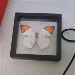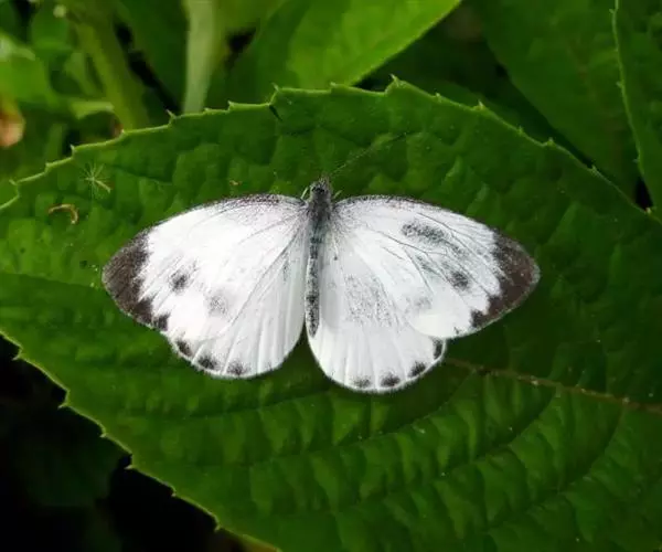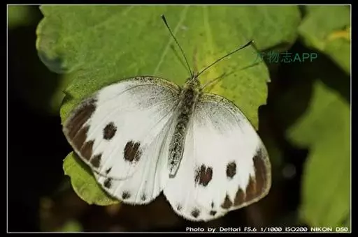 成虫:翅展45-60mm。体躯细长,背面黑色,头部和胸部被白色绒毛;腹面白色。触角端部匙形。翅正面白色;前翅的前缘脉黑色,顶角有三角形黑斑,并与外缘的黑斑相连而延伸到Cu2脉以下,黑斑的内缘呈锯齿状;亚端在m3室及cu2室各有1个黑斑,后翅前缘中部有1个黑斑,这3个黑斑均较菜粉蝶大而圆;后翅外缘各脉端均有三角形的黑斑。翅反面白色或乳白色,除前翅2枚黑斑尚存外,其余斑均模糊。雌蝶斑纹较明显,反面基部的黑鳞区较雄蝶宽。