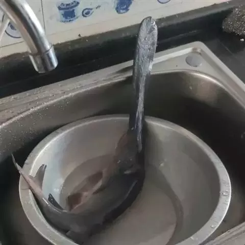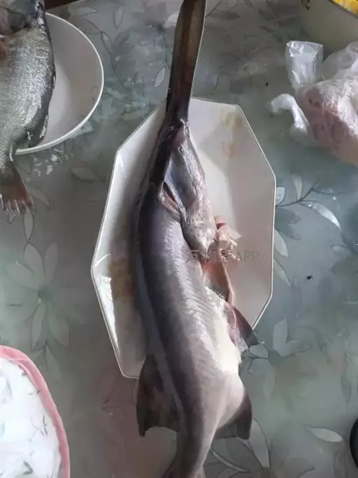 看其外观,鱼嘴扁平酷似鸭嘴,却比鸭嘴长几倍,50多厘米长的身子,又长又扁的嘴巴已经占了一大半。周身光滑,深灰色的鱼身,没有鳞片 。