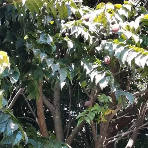 蒴果灰黄色或褐色,近球形或椭圆形,长4.5厘米,宽3.5-4厘米,顶端有小凸尖,无毛,表面粗糙而有淡褐色的小疣点;种子扁平,椭圆形,直径5毫米,有膜质的翅,连翅长1.2-2厘米。花期4-5月,果期7月至翌年1月。