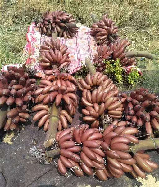 红皮香蕉20世纪70。年代从东南亚引入,属AAA群红绿蕉品种。假茎高3~4米,茎周长67~87厘米,除叶面呈绿色外,假茎、叶脉和中脉均呈暗紫红色。梳数、果数少,果指长17~20.5厘米,果皮暗紫红色,后期带绿条纹,果肉蛋黄色,肉质软滑,有特殊的兰花香味,果实总糖含量为20%~21%。红皮香蕉的产量低,株产10~20千克。该品种易突变为绿蕉,生长期较长,在15个月以上,抗病、抗寒力弱。红皮香蕉虽然缺点多,但由于其果皮为红色,有喜气的意思,不乏市场需求,已有商业化栽培。2003年3月份通过福建省农作物品种审定委员会审定 。