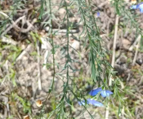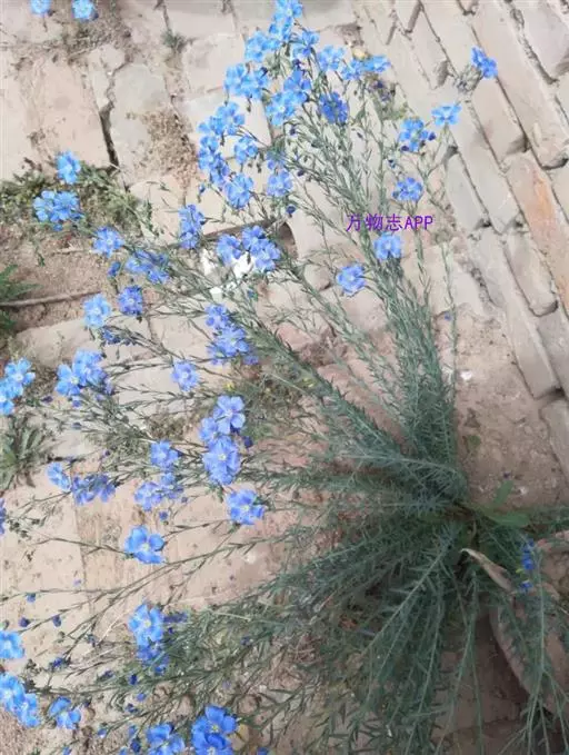 多年生草本,高20-90厘 米。根为直根,粗壮,根颈头木质化。茎多数,直立或仰卧,中部以上多分枝,基部木质化,具密集狭条形叶的不育枝。叶互生;叶片狭条形或条状披针形,长8-25毫米,宽8-3(4)毫米,全缘内卷,先端锐尖,基部渐狭,1-3脉(实际上由于侧脉不明显而为1脉)。花多数,组成聚伞花序,蓝色、蓝紫色、淡蓝色,直径约2厘米;花梗细长,长1-2.5厘米,直立或稍向一侧弯曲。萼片5,卵形,长3.5-5毫米,外面3片先端急尖,内面2片先端饨,全缘,5-7脉,稍凸起;花瓣5,倒卵形,长1-1.8厘米,顶端圆形,基部楔形;雄蕊5,长于或短于雌蕊、或与雌蕊近等长,花丝中部以下稍宽,基部合生;退化雄蕊5,与雄蕊互生;子房5室,花柱5,分离,柱头头状。蒴果近球形,直径3.5-7(8)毫米,草黄色,开裂。种子椭圆形,褐色,长4毫米,宽约2毫米。