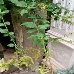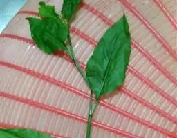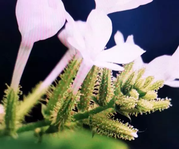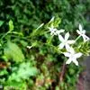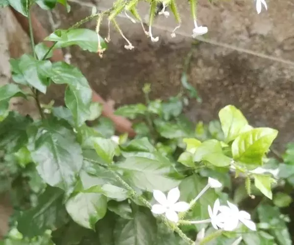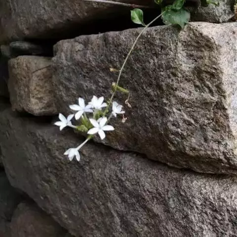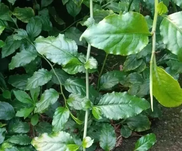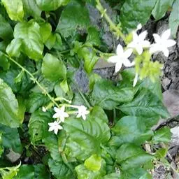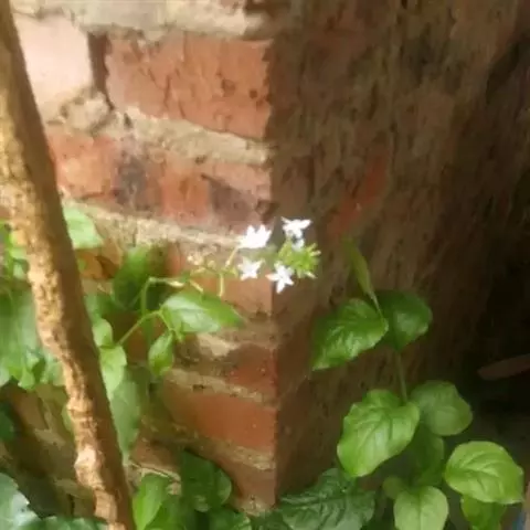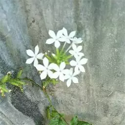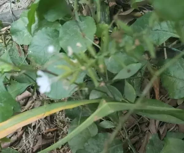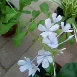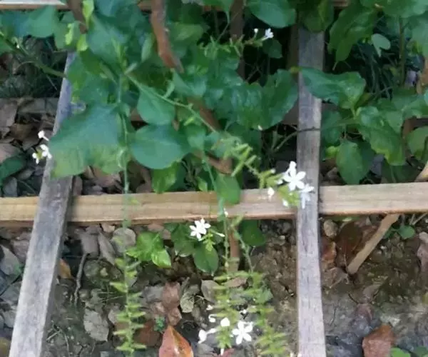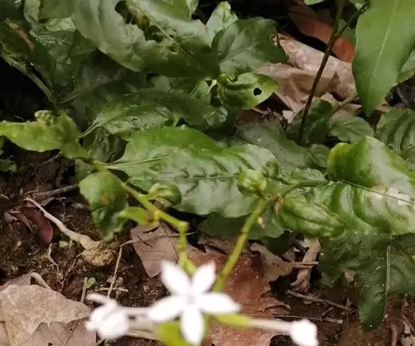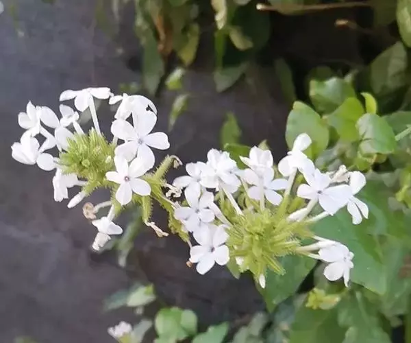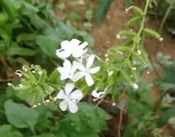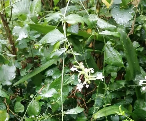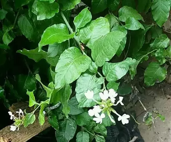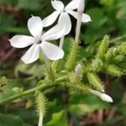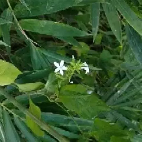 白花丹,多年生蔓生亚灌木状草本,高2-3m。茎细弱,基部木质,多分枝,有细棱,节上带红色,除具腺外,光滑无毛。单叶互生;叶柄基部扩大而抱茎;叶片纸质,卵圆形至卵状椭圆形,长4-10cm,宽1.5-5cm,先端尖,基部阔楔形,无毛,全缘。