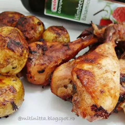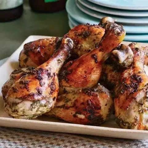 鸡下腿5只(约500克重),干葱2粒,姜汁1汤匙,靓虾酱1匙。糖半茶匙,酒1汤匙,生粉半汤匙配成腌料。
