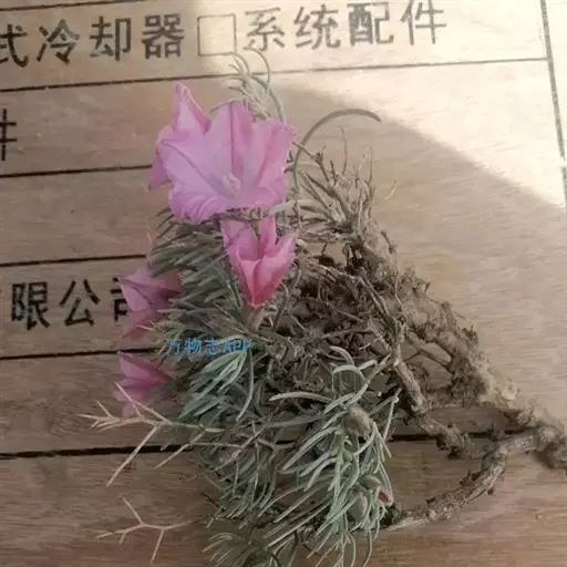 匍匐有刺亚灌木,全体被银灰色绢毛,高4-10-(15)厘米,茎密集分枝,形成披散垫状;小枝坚硬,具刺;叶狭线形,或稀倒披针形,长0.5-2厘米,宽0.5-4(5-6)毫米,先端圆形,基部渐狭,无柄,均密被银灰色绢毛。花2-5(-6)朵密集于枝端,稀单花,花枝有时伸长,无刺,花柄长2-5毫米,密被半贴生绢毛;萼片长5-7(8)毫米,椭圆形或长圆状倒卵形,先端短渐尖,或骤细成尖端,外面被棕黄色毛;花冠漏斗形,长15-25毫米,粉红色,具5条密生毛的瓣中带,5浅裂;雄蕊5,不等长,花丝丝状,无毛,基部扩大,较花冠短一半;雌蕊较雄蕊长;子房有毛,2室,每室2胚珠;花柱丝状,柱头2,线形。蒴果球形,有毛,长4-6毫米。种子卵圆形,无毛。花期5-7月。 刺旋花
