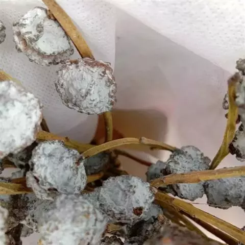 危害症状:病菌侵染插条嫩叶,迅速从上而下变黑干枯;若从切口处侵入,则从下向上腐烂,表皮剥离。但也有些插条感染后只导致部分损伤,并形成愈伤组织,阻止病菌蔓延,长出根系,地上部亦能抽芽展叶。病菌若从叶痕、芽鳞或微伤处侵入,则出现不规则斑点,病斑扩展连结,茎条干枯。染病的插条后期长出白色霉点或灰褐色点状物,即为病原菌的子实体。