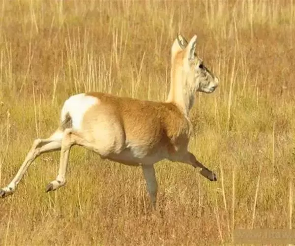普氏原羚奔跑时像离弦的箭,姿势与众不同,它将前肢与后肢分别并在一起,后肢用力后蹬,身体跃入空中,前肢前迈,着地时用力后撑,这种跳跃式的奔跑使羚羊的身体在空中划出一道波浪起伏的曲线,分外优美。
