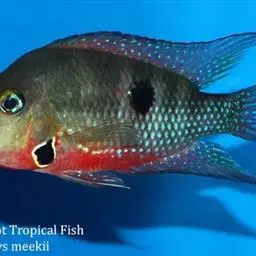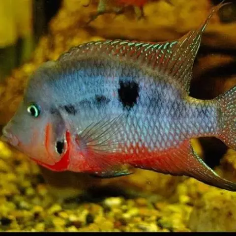 地图鱼形似罗非鱼,但身体更宽阔钝圆,头大、嘴大,背鳍基部很长,自胸鳍上方背部直达尾鳍基部,鳍条前部是锯齿状短硬棘,后部软鳍条较长,与臀鳍成对称状。腹鳍胸位,鳍端尖条形,尾鳍后缘圆形。鱼体的基色为黑色和黄、白色,上有不规则的高粱红斑点,间杂红色条纹斑块,颇似一幅地图,故得名地图鱼。尾鳍基部有镶金边的红色圆环,闪闪发光,酷似夏夜的星星,故又名尾星鱼。地图鱼有许多变异种。如红版地图、白、黄花、红眼地图鱼等。