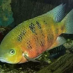 金菠萝鱼,Cichlasoma severum,慈鲷科丽体鱼属。成鱼体长20~25cm,厚侧扁形,…