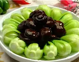 (2)把茄子肉切成段,装盆,撇上木鱼花,配以生姜泥和黄瓜。