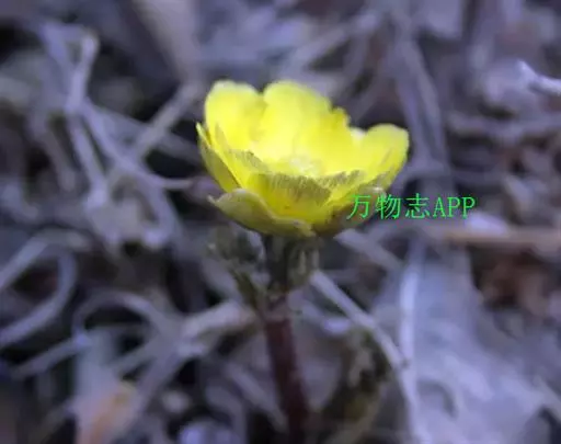 花直径2.8-3.5厘米;萼片约9,常带淡灰紫色,长圆形或倒卵形长圆形,与花瓣等长或稍长,长14-18毫米,无毛或近边缘有稀疏短柔毛;花瓣约10,黄色,倒卵状长圆形或狭倒卵形,长1.4-2厘米,宽5-7毫米,无毛;雄蕊长约3毫米,无毛;心皮多数,子房有短柔毛,花柱长约0.8毫米,向外弯曲,柱头小,球形。瘦果倒卵球形,长约3.8毫米,被短柔毛,有短宿存花柱。
