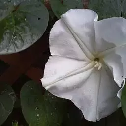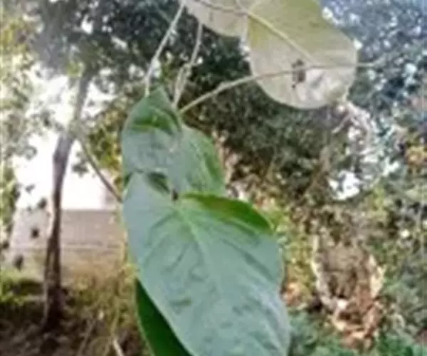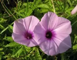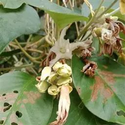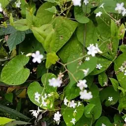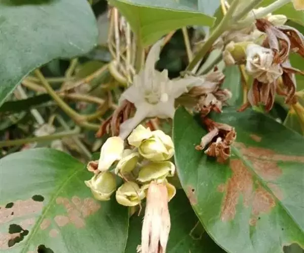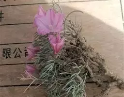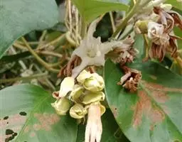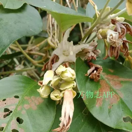 原形态:缠绕藤本。叶卵形至椭圆形,长5~11厘米,宽3~9厘米,先端短尖或钝,基部浑圆或有时微心形,上面秃净或近秃净,下面密被银色紧贴的柔毛。花序腋生或顶生,头状或伞状;花序柄长3.5~7厘米,密被银色柔毛;花柄短,长约5毫米或不及;苞片大,萼片5,矩圆状卵形或卵形,外面的长9~10毫米,内面的较小,外密被银色柔毛;花冠漏斗状,白色,长2.7~2.8厘米,外被银色偃毛,裂片矩圆形,长1.5厘米内外;雄蕊5;子房4室,花柱线形。果近球形,径约8厘米,胭脂色,为卵形凹陷的宿萼所包围。花期秋季。