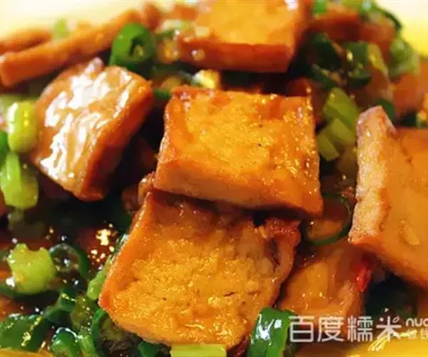 将豆腐切成骰子大小的方块,蒜苗切成末,倒入菜油,温热时倒入豆腐翻炒,撒姜末、喷料酒后,即盖上锅盖半分钟,然后加糖2小勺(根据个人喜欢增减)、盐(1小勺)、老抽酱油(2大勺)翻炒,最后盛盘,撒蒜苗末即可。