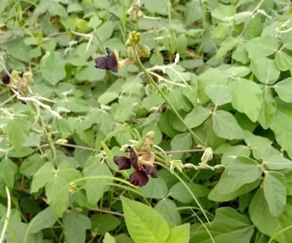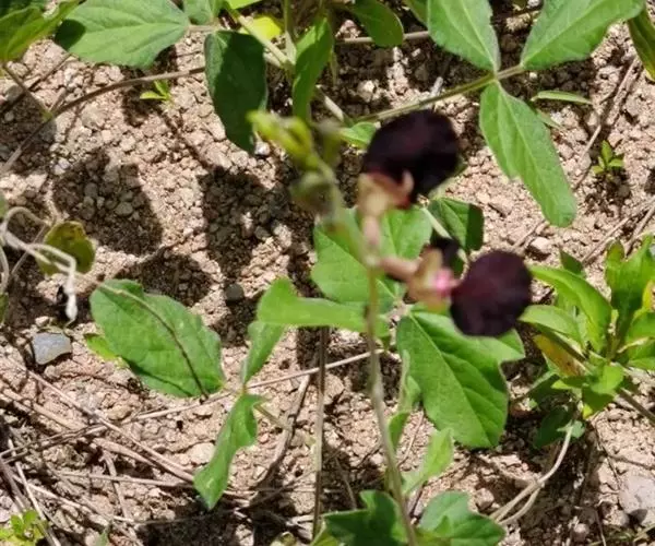 多年生蔓生草本。根茎深入土层;茎被短柔毛或茸毛,逐节生根。羽状复叶具3小叶;托叶卵形,长4-5毫米,被长柔毛,脉显露;小叶卵形至菱形,长1.5-7厘米,宽1.3-5厘米,有时具裂片,侧生小叶偏斜,外侧具裂片,先端钝或急尖,基部圆形,上面被短柔毛,下面被银色茸毛;叶柄长0.5-5厘米。花序轴长1-8厘米,总花梗长10-25厘米;花萼钟状,长约5毫米,被白色长柔毛,具5齿;花冠深紫色,旗瓣长1.5-2厘米,具长瓣柄。荚果线形,长5-9厘米,宽不逾3毫米,顶端具喙尖,具种子12-15颗;种子长圆状椭圆形,长4毫米,具棕色及黑色大理石花纹,具凹痕。