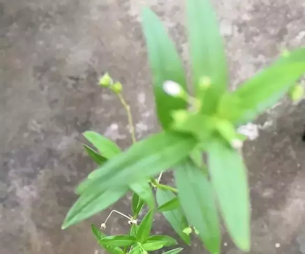 一年生柔弱披散草本,高10-40厘米;茎和枝方柱形,无毛或棱上疏被短柔毛,分枝多,直立或蔓生。叶对生,近无柄,膜质,线形,罕有狭披针形,长1-2厘米,宽1-3毫米,顶端短尖,基部楔形,干时边缘背卷,两面略粗糙或上面的中脉上有极稀疏短柔毛;中脉在上面下陷,在下面平坦或微凸;托叶膜质,鞘状,长1-1.5毫米,顶端有数条短刺。花序腋生,伞房花序式排列,有花2-4朵,罕有退化为单花,具纤细如丝、长5-10毫米的总花梗;苞片微小,钻形,长1-1.2毫米;花4数,有纤细、长2-5毫米的花梗;萼管球形,被极稀疏柔毛,基部稍狭,直径1-1.2毫米,萼檐裂片狭三角形,长约1毫米,具缘毛;花冠白色或粉红色,管形,长2.2-2.5毫米,喉部无毛,花冠裂片长圆形,短于冠管;雄蕊生于冠管内,花丝极短,花药内藏,长圆形,长0.6毫米,两端截平;花柱长1.3毫米,中部被疏毛,柱头2裂,裂片略阔,粗糙。蒴果膜质,球形,直径1.2-1.8毫米,有不明显纵棱数条,顶部平,宿存萼檐裂片长1-1.2毫米,成熟时顶部室背开裂;种子每室10粒以上,有棱,种皮平滑,干后深褐色。花、果期几乎全年。