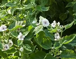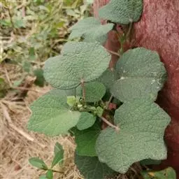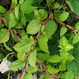 略直立或匍匐状半灌木,长达1米,多分枝,小枝密被短柔毛。叶卵形或长椭圆状卵 形,长2.5-4.5厘米,宽1.5-3厘米,顶端钝,基部圆形或浅心形,边缘有小齿,两面均密被短柔毛;叶柄长0.5-1厘米。