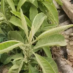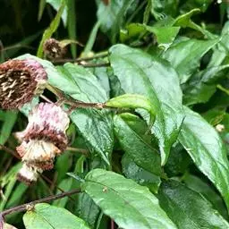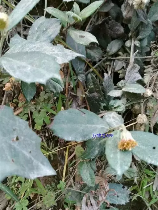 茎表面浅棕色,近无毛。叶多皱缩破碎。完整叶片椭圆形或卵状椭圆形,长7-10cm,宽2.5-4cm,顶端尖,基部楔形或圆形,浅棕褐色,上面粗糙,无毛,下面被微毛或近无毛,边缘具小齿,网脉极明显,叶柄长2-5mm,被柔毛。有的残留有头状花序。气微,味微苦。